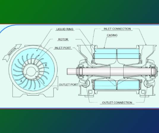 Kakati liquid ring vacuum pumps and compressors are rotary machines in which liquid is made to act as piston. This liquid is generally water for most of the applications. Hence these are known as Water Ring, water piston or Liquid Piston rotary pumps and compressors. A balanced rotor with fixed radial blades having slight curvature at the tips and a hollow hub revolves in a circular casing containing the liquid. The axis of rotor is placed eccentric with the axis of casing. At the operating speed the liquid rotates in the casing forming a circular hollow ring whose internal surface is at varying distance from the axis of rotor.